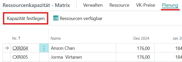 Um einer Ressource neue Kapazitäten zu geben oder zu ändern, wählen Sie die gewünschte Ressource in der Matrix aus und navigieren Sie im Menü zum Reiter Planung und führen die Aktion „Kapazität festlegen“ aus.
