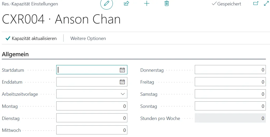 Hier können Sie nun den Zeitraum und Stunden für die ausgewählte Ressource festlegen.
